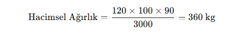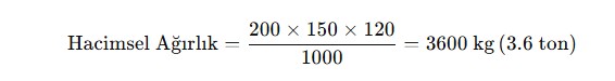 Örneğin, ölçüleri 200 cm x 150 cm x 120 cm olan bir gönderinin hacimsel ağırlığı şu şekilde hesaplanır: